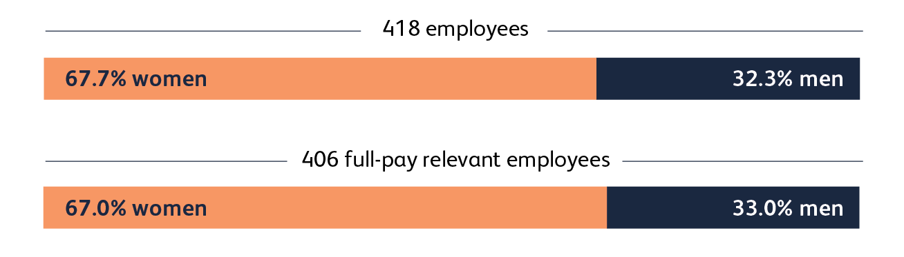 The number of full-pay relevant employees used to calculate our gender pay gap was therefore 406 staff (272 women and 134 men). This is a decrease from 2024 (460), primarily due to the lower number of casual workers that fell under relevant employees during this period (46; 2024: 82)). Casual workers include examiners and clinicians employed on a short-term basis for projects. The RCP employed workforce excluding casual workers was made up of a total of 372 staff, comprising 254 (68%) women and 118 men (32%).