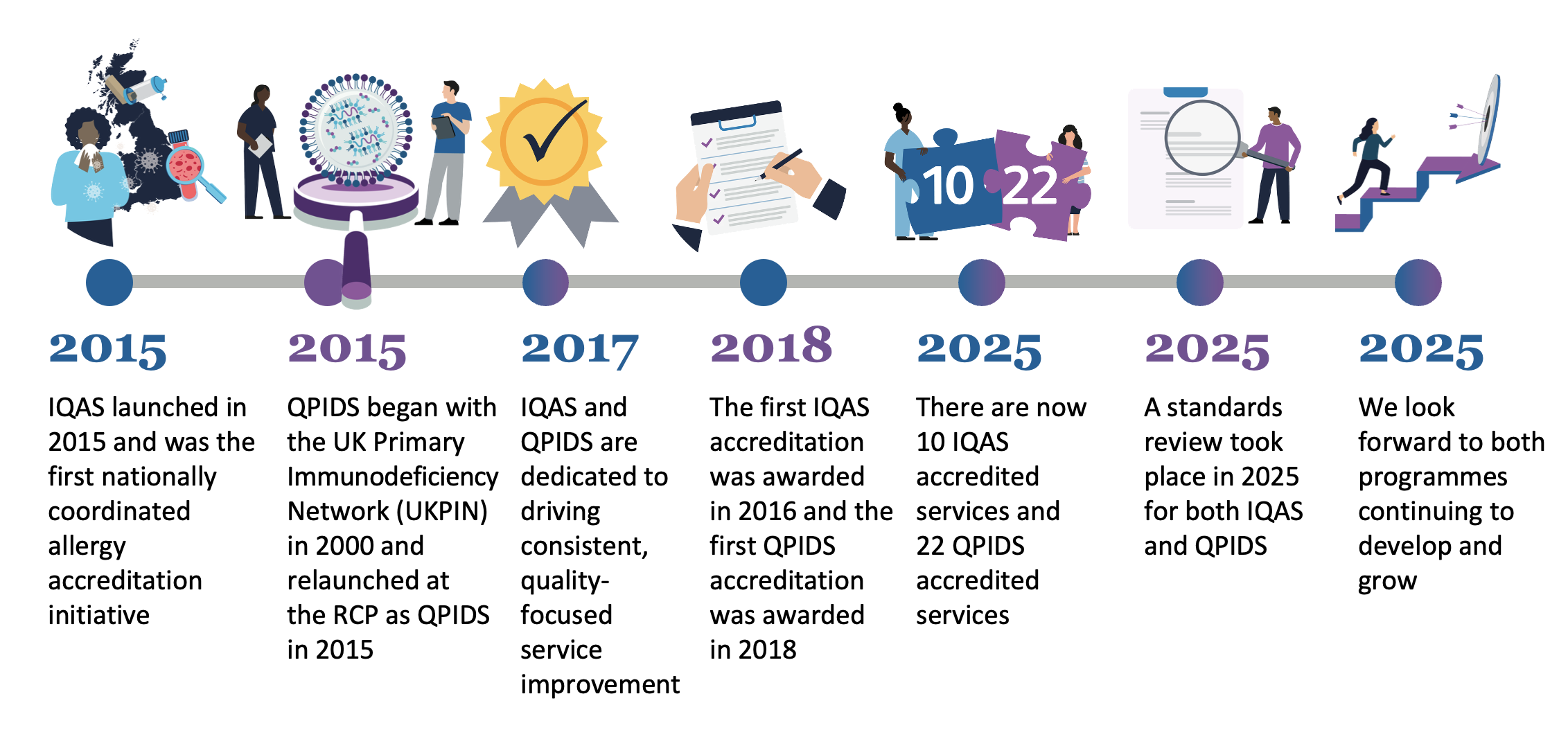 IQAS, celebrating its 10-year anniversary, was established as a result of the 2003 RCP report Allergy: the unmet need. This report highlighted inconsistencies in allergy services and called for standardisation and quality improvements. IQAS formally opened for registration on 25 November 2015, marking the first national allergy accreditation initiative.