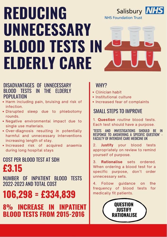 This quality improvement project (QIP) aimed to reduce the number of unnecessary and unjustified blood tests at an elderly care ward in a district general hospital.